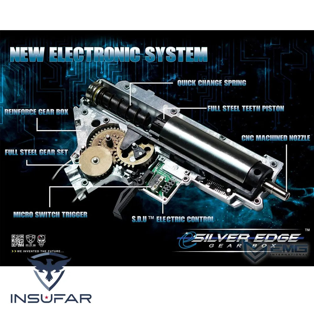 Equipada con el gearbox eSilver Edge de alta eficiencia, esta AEG está optimizada para rendimiento, durabilidad y eficiencia energética. Su construcción en aluminio CNC, el handguard H7M M-LOK de 14.3", el cañón externo de 16" y el freno de boca Dragon Slayer licenciado aseguran una plataforma robusta, lista para adaptarse a cualquier situación de juego o entrenamiento.