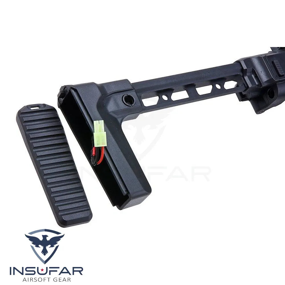 Cuenta con un guardamanos M-LOK con riel Picatinny/20mm RIS continuo en la parte superior, permitiendo la instalación de accesorios como miras, linternas y láseres. Además, posee un bloqueo lateral reforzado que asegura la estabilidad de la réplica al desplegarse.
