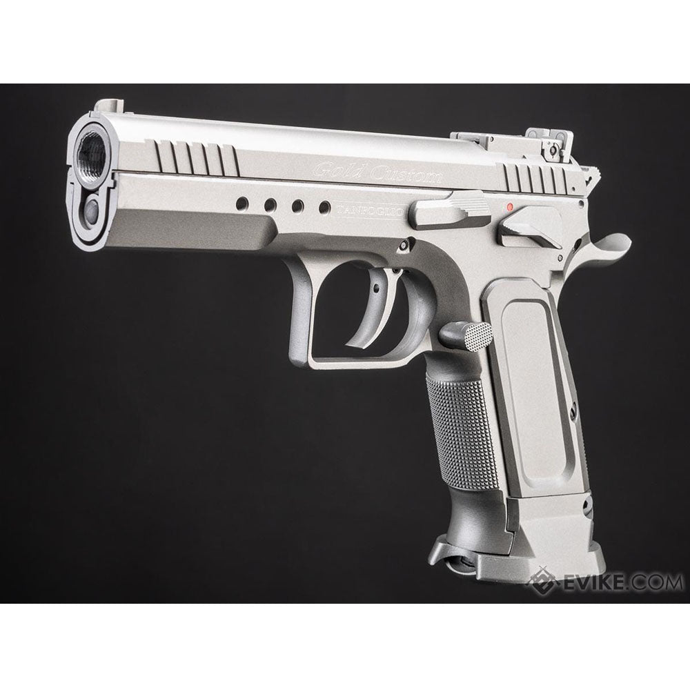 La Cybergun Tanfoglio Limited Edition Custom es una pistola de airsoft de edición limitada, completamente licenciada por Tanfoglio y fabricada en colaboración con KWC. Esta réplica destaca por su construcción metálica completa y un diseño inspirado en las preferencias del legendario campeón mundial de IPSC, Eric Graufell. La Tanfoglio Gold Custom ofrece un desempeño sobresaliente, gracias a su sistema KWC "BAX" que garantiza una alta precisión y confiabilidad. Esta pistola es ideal para jugadores de airsoft y competidores que buscan una réplica de calidad y distinción.