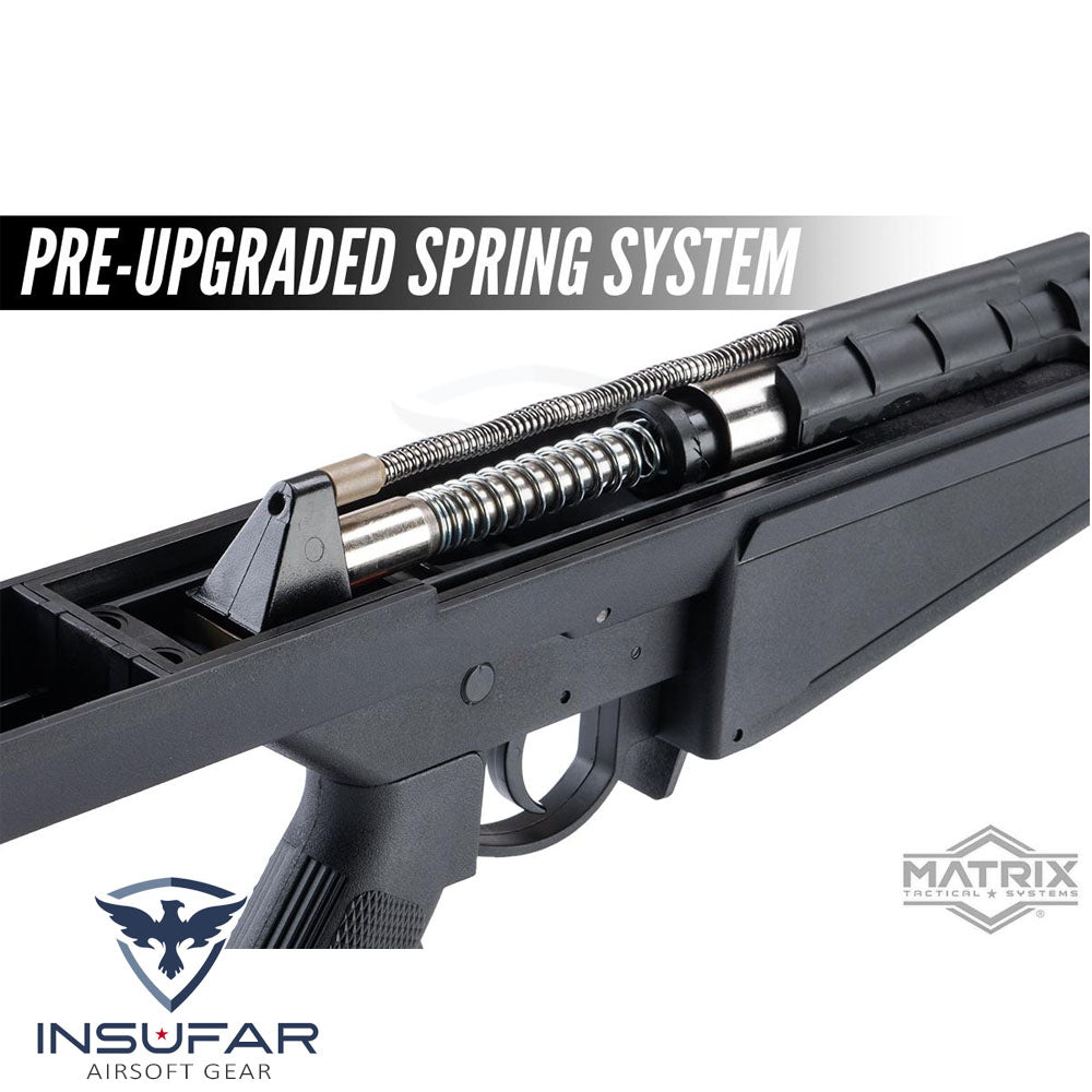 Con un riel superior Picatinny de longitud completa, el M82A1 permite instalar diversas ópticas y accesorios. La culata cuenta con una almohadilla de goma para mayor comodidad, y su cargador de 25 rondas incorpora un sistema de alimentación confiable y un compartimento de almacenamiento adicional para BBs o herramientas.