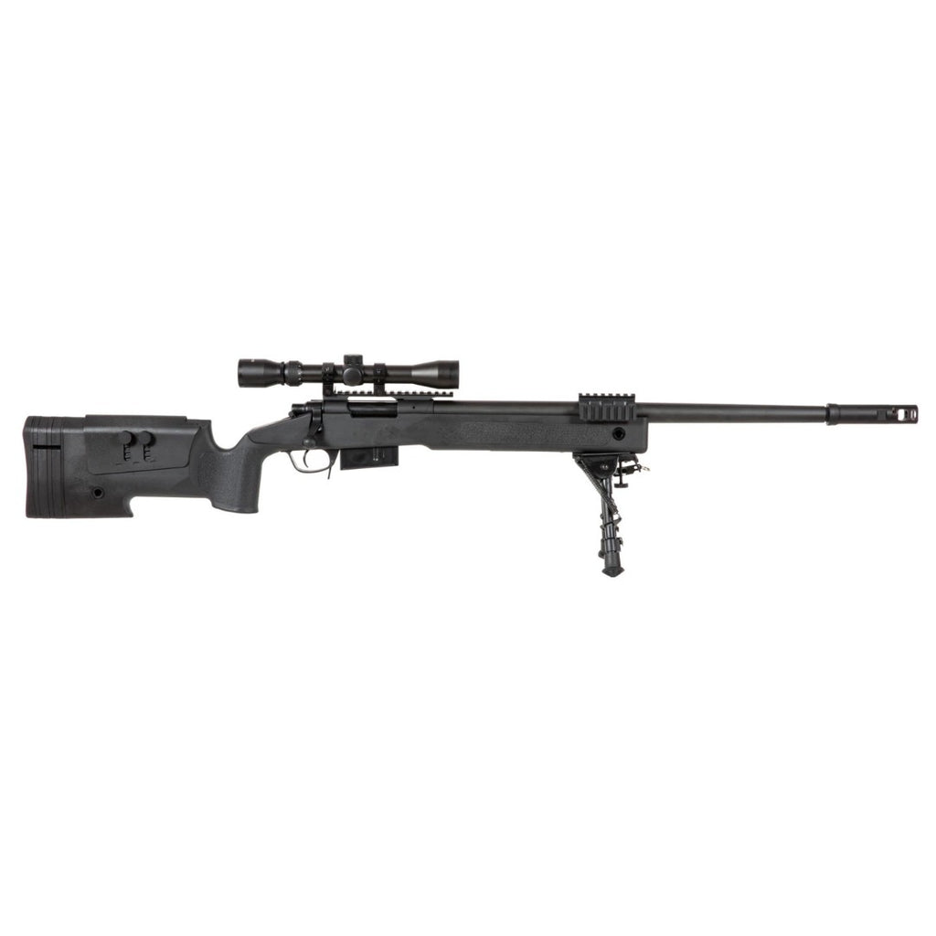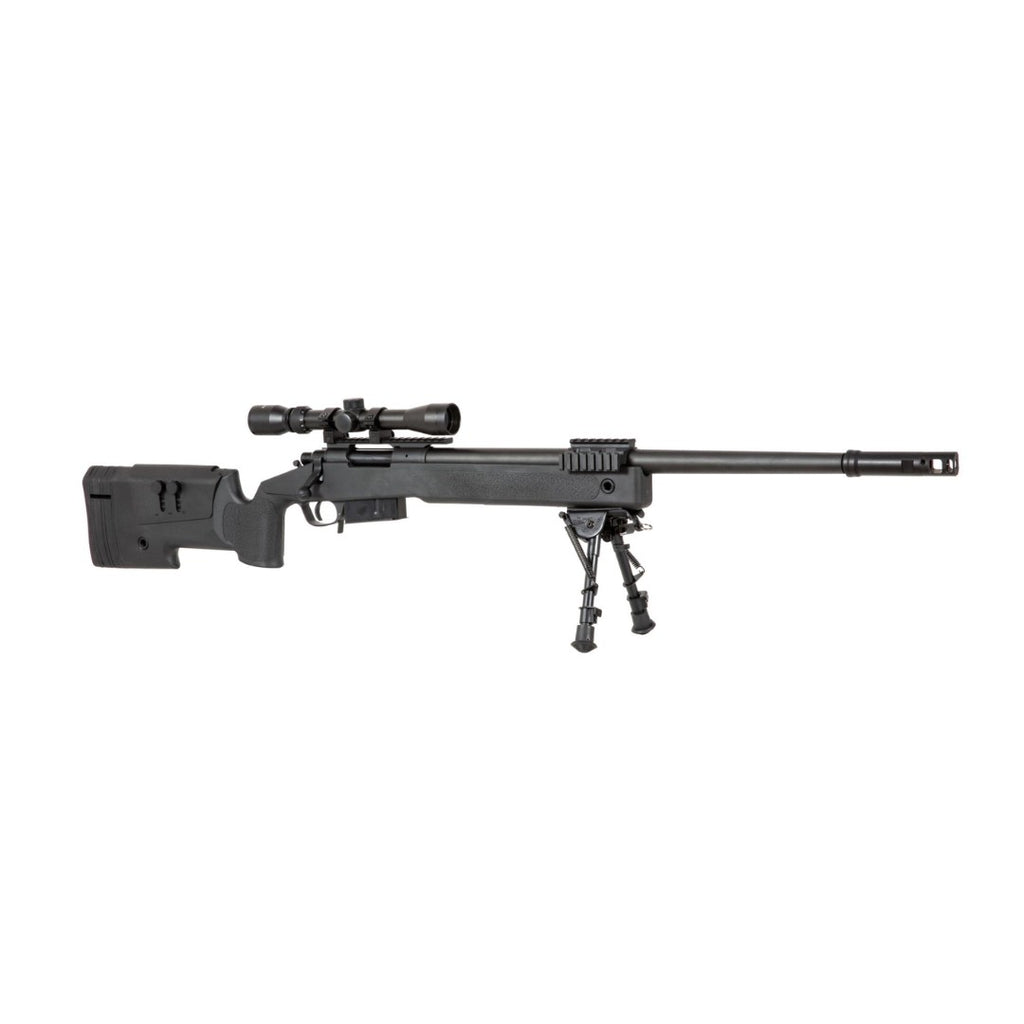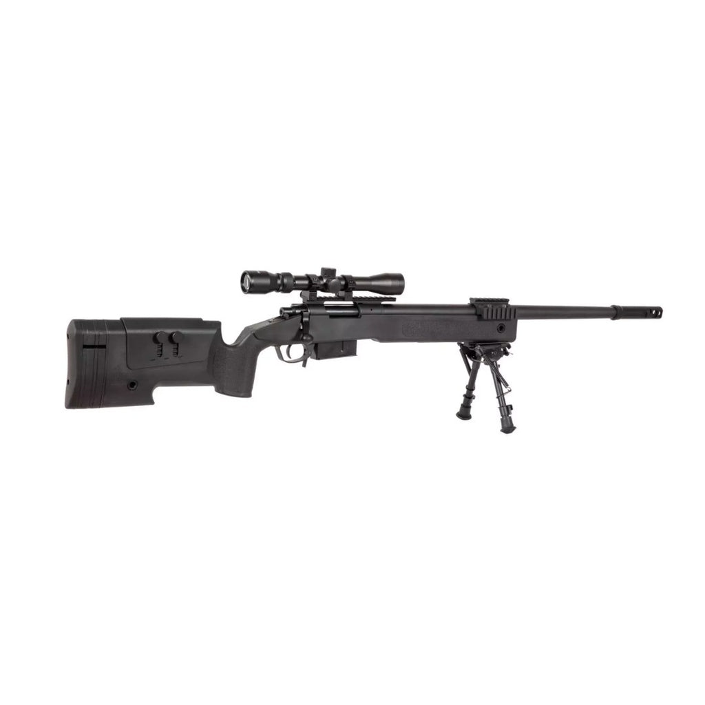 El set incluye mira telescópica 3-9x40, bípode y 3 cargadores, ofreciendo al jugador un kit completo de francotirador listo para el campo.